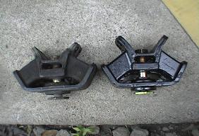 左が取り外したミッションマウントです。 新品と比べると、かなり下側に押されているのが良く分かります。 ノギスで測ったところ、最大で5ミリほど下がっていました。 これでしばらく安心してギアチェンジが出来るようになりました。(^^) 何だか最近ギアの入りが悪いなぁと感じる人は交換をお勧めしますよ〜。 満足度90%! |