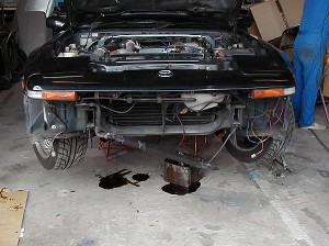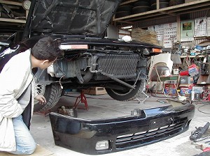 まずエンジンオイルを抜きます。オイルを抜いている時間を利用してバンパー・インタークーラー・アンダーカバー等を外していきます。 ネジがたくさんあるので間違えないように。(^^A 順序良く外し、外したボルトをちゃんと整理しないと、あとでわけが分からなくなります。。。 |