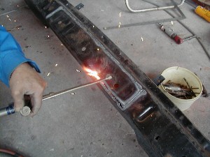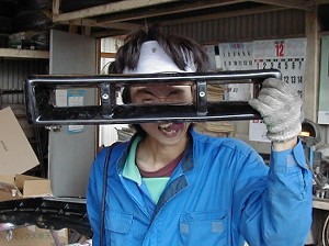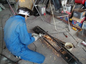 | バンパーホースメントはバーナーで切り抜いてもらい、その切断面のバリをサンダーで削り取りました。 |