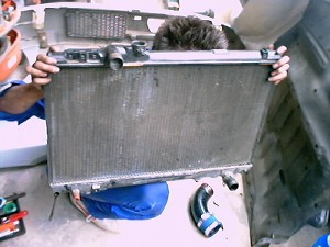 | 無事に外れた(?)純正ラジエターです。外側はマメに洗い流してたつもりですが随分汚れてました。 |