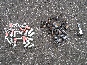 付属していた交換用ボルト(左)と取り外したボルト(右)。 ここにはしっかりとネジロック剤がついているのが分かるかと思います。 一番右に写っているのはボルトを外すために購入した六角レンチつきのコマです。 |