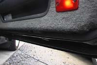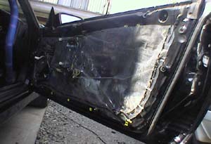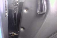 ドアの下のほうに5本のねじが隠れています。 あとはクリップで留まっているだけなので、 気合一発で剥ぎ取ります(笑)。 |