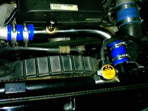 ステンアッパーホース取りつけ完了後の画像。 青いホースバンドとステンレスの輝きがとてもすばらしいです(笑)。 ちなみにこの画像では水温計が装着されていない状態となっています。センサーを取り付ける穴を塞いでいる栓を六角レンチで取り外し、水温計のセンサーをねじ込むことになります。水温計のメーカーによってセンサーの太さが異なりますが、その辺はきちんと考慮されていてアダプターが二重になっているのは嬉しいですね。(^^) また、センサーを取り付けるときはシールテープを巻いてLLCの漏れを未然に防ぐのがベターですね。 満足度90%! |