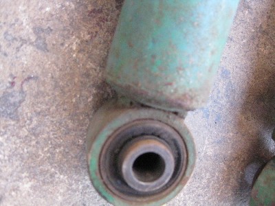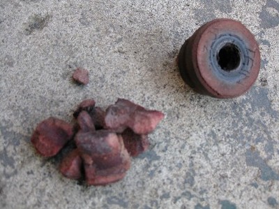 ピロブッシュ化する前のロアアイリングブッシュの状態。 左側のブッシュにねじれるようなスジが見えるのが分かりますね。 ロア側のボルトを締めるときは1G状態にしてから本締めしなくてはいけないという理由がこれで証明されました。(^_^;) 今回これをピロ化するので、1G締め込みが必要なくなるのですが、この考え方は忘れちゃいけないポイントと思います。 |