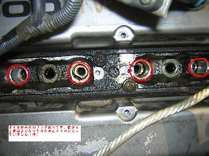 | プラグを全部抜いて上から撮ったところです。かなりオイルまみれでした。 |