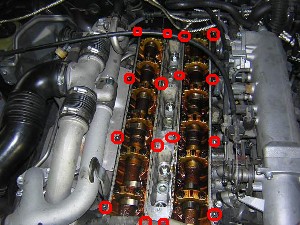 ヘッドカバーをはずす作業に入ります。4枚目で黄色にマルしたところを外します。 ブローバイのホースも外すんですが、かなり硬化しているので外すのに苦労しました。 そしてパキパキに割りました(爆) 新しいものは用意してから作業するほうが望ましいです。 万が一用意できずに割れてしまった場合はビニールテープでぐるぐる巻きにして下さい。(笑) |