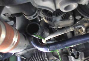 ホースを抜いた途端にクーラントのシャワーでした! おかげでおいらは頭からかぶっちゃいました(笑)。 |
