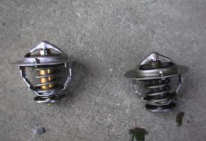 左がビリオン製で、右が純正サーモスタット。 開弁温度が82℃から72℃に引き下げられます。 |