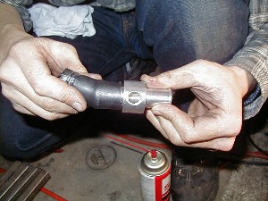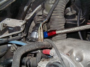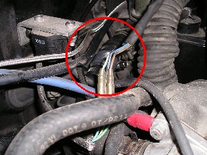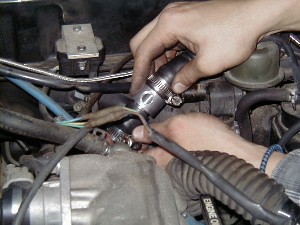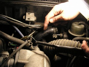 今度はエンジン本体側のヒーターホースにねじ込みます。 こっち側は手が届きにくいのとホースの硬化度合いが更にひどいのでもっとツライです。(^_^;) あ、それから、バイパスアダプターの側面にあるバイパスホース取付穴の向きをちゃんと考えながらねじ込んでください。それとホースバンドも先に入れてくださいね!入れなおしとかになった場合、額からあぶら汗が出てくることでしょう(笑)。 |