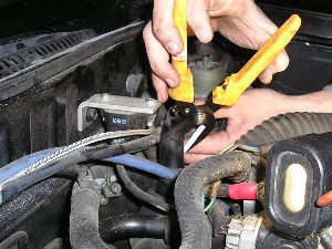 続いて、ヒーターホースの切断です。ヒーターホースはバルクヘッド側にある一番太いホースになりますが、切断するにはCPUハーネス等が邪魔なので周りにあるものを全部どかしていきます。 そして、クランプを緩めてホースを抜き取ってから切断するんですが、この時冷却水が飛び散りますので注意してください。 切断箇所は、アルミ製のアダプターの足が3cm程度と長いことを考慮して、なるべく直線的な部分を切断する方が後の作業に影響を与えなくてすみます。位置的には画像にある場所が一番適当でしょうか。これを失敗するとヒーターホースの全取替えにも繋がるトラブルにもなりかねないので注意してください。 ホースの切断には専用のハサミを使ってください。ラッキーにも001さんが専用ハサミを持っていたので、おいらは借りることができました。切断面がきれいになりますよ〜。 |