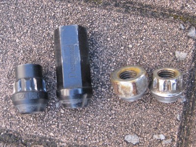 リーガマスター純正ホイールナット(左)と、普通の安物ナット(右)。 持ち比べてみると、その軽さがすぐに分かります。 ロックナットの方は短いからバランスが、、、って気になりますが、元々が軽いので、その差はほぼ無いに等しいです。 ちょっと残念なのが傷が付いていること。でも中古だから仕方ないし、自分がやっても同じ傷が付くでしょうしね。 |