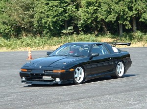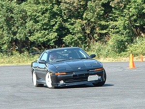 ちなみに同じポイントでのおいらのスープラの画像がこれです。 車体の向きが全然違いますよね。。。もっとクルマ全体を振り回すようにしないとダメでしょうか。あとはアンダーステアを殺すようなステアリング操作が必要だと実感しました。外から写真を撮ってもらうと良い勉強になります。 |