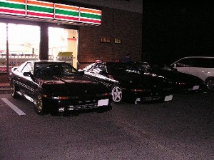 サーキットの朝は早い!外はまだ真っ暗です。(^_^;) 朝食をGETするために実家近くのコンビニで休憩しているところ。 手前からサカイ号、ままま号、tetu号になります。 |