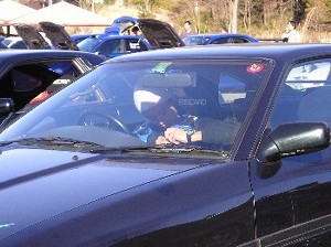 走行前の緊張をほぐすかのように踊りまくる001さん(爆)。 朝1回目の路面温度の低い状態でも、一番アクセルを踏んでいたのが001さんでした。(‥;) そして、お昼頃ちょうど温度が高くなってきた頃にベストラップ更新を果たしました!001さんは毎回ベストラップ更新しているようなのでホント凄いです。 |