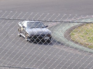 同じく第1ヘアピン通過中の001号。 サーキット慣れしているだけあって、最初から結構飛ばしていましたね〜。他のクルマを抜いていくポイントを押さえていて上手かったです。 |