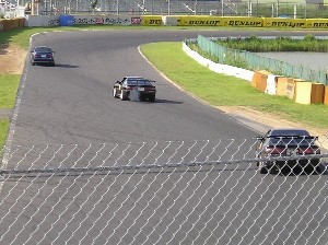 第1ヘアピン通過後のままま号と001号。 ダンロップ手前コーナーでアクセルを緩めた瞬間、マフラーから火を噴くそうですが、残念ながらデジカメ画像におさめることはできませんでした。(^_^;) |