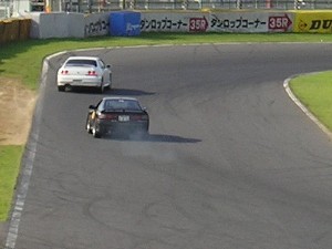 同じくダンロップ手前コーナーでスカイラインをアオりまくるサカイ号。 サカイさんは筑波2000初走行だったんですが、後半になるとかなり慣れてきたみたいで、いつものようにアクセル全開できてきたようです。 ラジエターやオイルクーラー装着の効果も高かったみたいですね。(^^) |