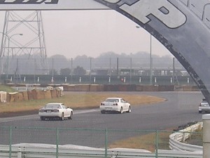 夢朗号と34GTRのバトル! 夢朗さんもかなり意識していたらしく、おいらも見ていて「おぉ〜〜!!」って叫んでしまうくらい激しいバトルでした(笑)。 画像ではそれをうまく伝えるのが難しいのが残念です。 ダンロップ下を抜けた直後で、この車間でフル加速していると言えば分かるでしょうか?! |