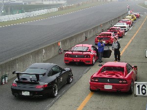 当日はいくつかのショップ合同の走行会だったようです。 そんな中、フェラーリ&ポルシェ専用グループが存在していて、その場所だけ雰囲気が違ってました。(^_^;)。 走行が開始されるとフェラーリ独特の甲高いエキゾーストノートが響き渡ります。 一度でいいからクルマの中からその音を聞いてみたいですね〜。 |