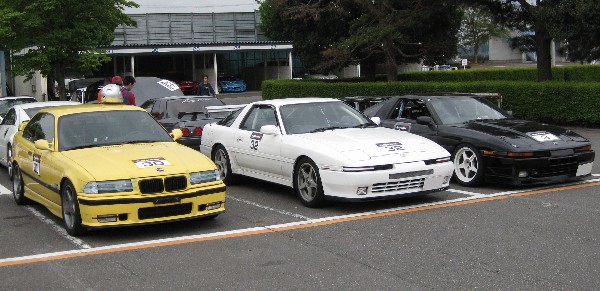 受付直後に3台並んで記念写真。 まだこの時は土砂降りになることなんてちっとも思っていませんでした。(^_^;) |
