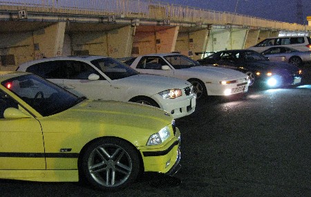 走行終了後の集合写真! いい感じに夕暮れ時になってヘッドライトが眩しい。 ままま号のフォグが青すぎるような気も。。。 |