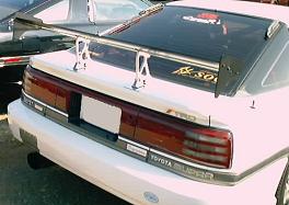 すぷらさん自慢のGTウィング。やはり白いボディにGTウィングは似合いますね。 あと、ボメックスのリアアンダーも取り付けていました。おいらと似ている仕様ですね〜(爆)。 |