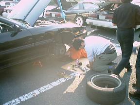 す〜むすさんの70にTEINの車高調を取り付けているところ! すがさんと亀山さんがテキパキと作業をこなしていって、あっという間にフロント側は終わりました。だけど、お昼ご飯のタイムでフロントのみで作業終了でした(爆)。 |
