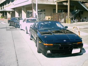 左から順番にスープラ達を撮影しました。画像はたいらあさんから提供してもらいました。ありがとうございます。m(__)m 左から、おにむし号、サカイ@JZA70号、TEMMYE号。サカイ号の室内に向かって誰か二人が顔を突っ込んでいます(笑)。 |