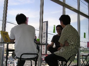 二階の休憩所でスープラ談義にのめり込んでいる3人(笑)。