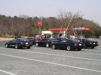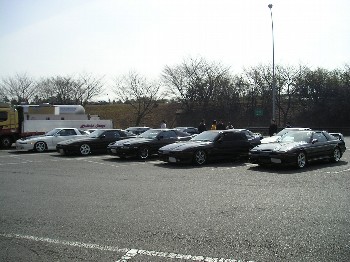 本当の第1集合場所の友部SAで集まったところ。 広い駐車場の一角に、70スープラだらけの集団がいるので、通りがかりの観光バスの乗客はみんな注目していました(爆)。 |