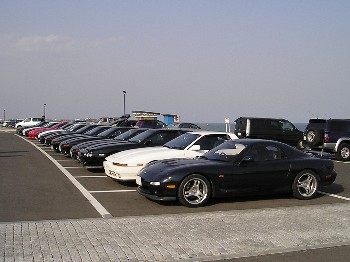 海岸沿いの駐車場で1列に並んでいるところ。ここでドレスアップコンテストが開催されました。 海をバックして自分の愛車の写真を撮る人も多かったですね。 あと、コンテスト中に途中参加の李 少林さんとサカイ@JZA70さんが合流しました。 |