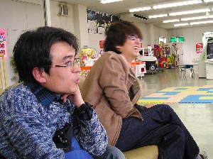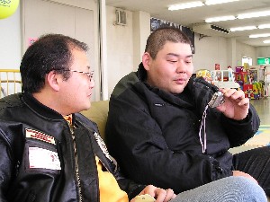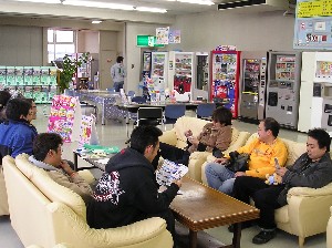 集合場所はいつものカー用品店の2階休憩室。 ソファーの一角を占拠してだべります(笑)。 主賓のサカイさんはなぜかソワソワ?!(爆) |