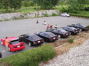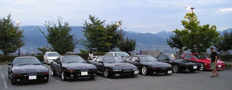 正面からスープラ軍団をパチリ。 カズさんのスープラをみんなで囲んでいます。何をやってるところだったのかな?! 真ん中は亀山さんによるピオーネの差し入れをみんなに配っている所です。 |