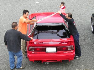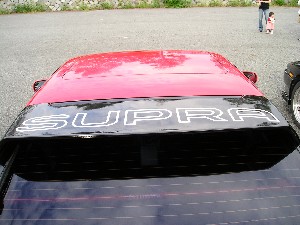 リアハッチバイザーに「SUPRA」ステッカーを貼ろうとしていたんですね。 元々この山梨オフは亀山さんのステッカーをlainさんに渡すという話もあったんです。 こんな大きなステッカーだと一人で貼るのは難しいですよね〜。なので現地貼り付け作業が始まったんです。 ちなみにlain号の奥に見えるのはすぷらさんの愛娘のもみじちゃん。当日はみんなに愛想を振りまいて人気者でした(笑)。 |