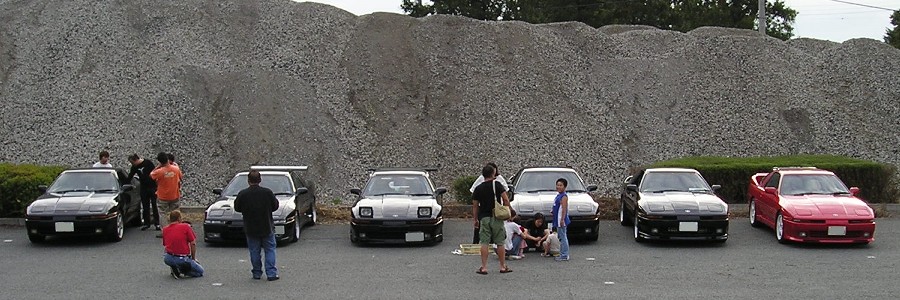 駐車場の近くにあった砂利の山の上から70スープラ軍団を撮影! 奥のほうにこっそり置かれているシルバーのビートルはすぷらさん号です。 lain号のところで何やらゴソゴソ作業しているみたいですが、、、。 |