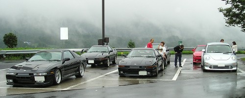 第一集合場所の談合坂SAでそろったクルマたち。 雨が降ったりやんだりと不安定な天気でしたが、山梨に着く頃にはいい天気になりました。(^^) |