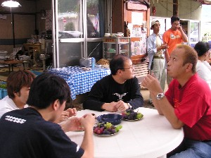 同じく試食用ぶどうを食いまくる大人たち(笑)。 皮ごと食える甲斐路というぶどうもうまかったです。 |