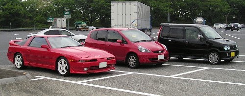 第1集合場所での集合写真! 70スープラと通りすがりのクルマたち、、、ではありません!(爆) 手前からlain号、ままま号セカンドマシン、Suga号です。 |