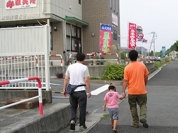 近くの農協の販売店へお買い物。 泰希君は亀山さんだけじゃなくlainさんも手をつないでいました(笑)。 |
