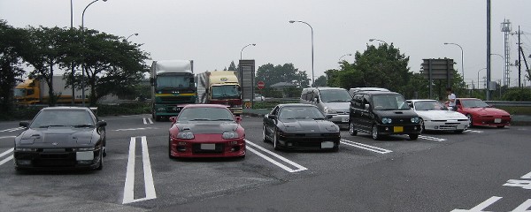 集合場所の羽生PAで記念撮影。 今回初参加のラフさんの80スープラが目立ちますね〜。 ちなみに、おいらが羽生PAに入るところをしっかりロックオンされてました(笑)。 |