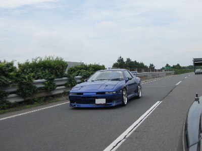 白い70スープラ夢郎号。 このあと北関東自動車道で気合が入りすぎてエンジンカバー脱落に。(^_^;) いつか見た光景です(笑)。でもそこは慣れっこで落ち着いて対処する夢郎さんがいました(爆)。 |