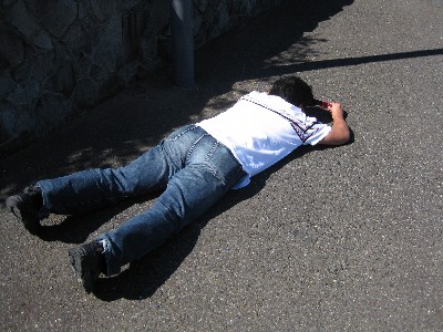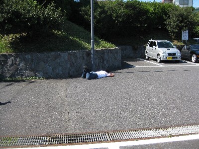 駐車場の隅に死体が?!(爆) いや、もぞもぞ動いているので死体ではないようです(笑)。 近寄ってみると、、、 |