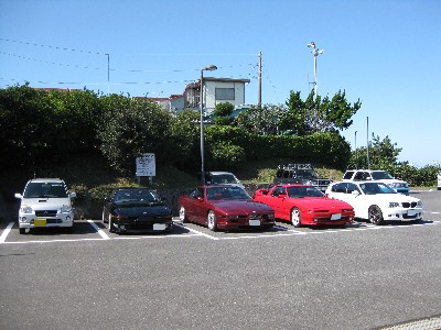 集合場所の幕張PAでの記念撮影! トラック用の広いスペースをふんだんに活用して贅沢な停め方をしています(笑)。 ちなみに、左から2番目のクルマは、一見して70スープラに見えますが違います(笑)。 |