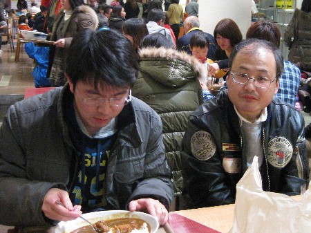 カレーをむさぼる夢朗さんとカメラ目線のlainさん。 夢朗さんもやっぱり辛いものへ(笑)。 この日は寒かったせいもあって温かくて辛いものが売れていましたね〜。 |