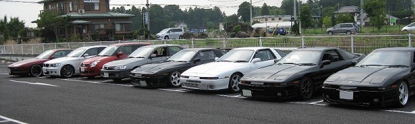 反対側から撮影したところ! 70スープラも4台そろってよい感じです。(^^) この後解散したのですが、帰り道ももちろん北関東自動車です! フロント周りについた虫が多いので、帰宅後はすぐさま洗車するのが吉。(^_^;) 可能ならインタークーラーとかも洗ったほうが良いですね〜。 |