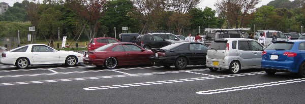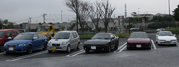 第一集合場所の京葉道路・幕張PA。 最近改装されたらしく、建物もキレイになりました。 一番左の青いマシンがかんちゃんのニューマシン、真ん中の黒いスープラがhaneさんの70です。 |