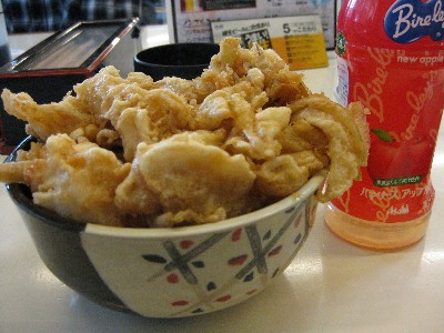 これが「ばんや」名物のイカ天丼。 味も抜群ですが、量もビックリするぐらい多い(笑)。 ヘタに大盛りを注文すると他のものが食べられなくなるので注意。(^_^;) |