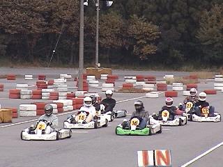 決勝レースのスタートです。 おいらのチームは始めにごすけさんに走ってもらうようにお願いしました。3番のカートがそうです。 スタートするこの瞬間がたまらなく緊張するんですよね〜! |