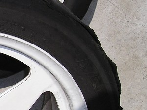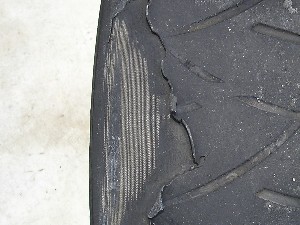 ロックさせたところだけがダメになったわけではなく、タイヤ全周に渡ってゴムの剥離が始まっているのが分かると思います。 この状態でそのまま走り続けていたら、間違いなくバーストしていたでしょう。 |