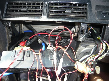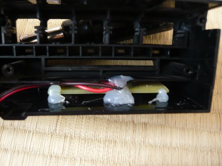 『風量』の取り付けです。 ここは純正のユニットを取りつける場所ですので、なるべく奥に両面テープで固定します。 光がムラにならないようAC/DCアダプターを使い点灯しながら位置を決めます。 |